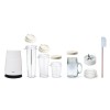 - 1 bloc moteur, 1 bloc 4 lames, 1 gobelet plastique 150 ml, 1 gobelet plastique 300 ml, 1 gobelet plastique 450 ml, 1 mug en verre 450 ml, 2 couvercles avec orifice, 2 couvercles de conservation, 1 spatule et 1 adaptateur pour gobelets en verre